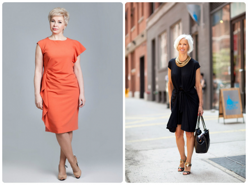 - Дамам с животом за 50 лет стоит выбирать модели свободных фасонов, а также такие, где акцент делается на зоне декольте или стройных ногах.