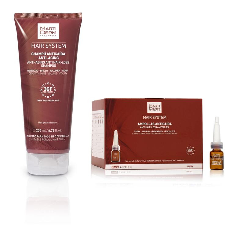В системе — два средства, которые действуют дружной командой. Сыворотка в ампулах MartiDerm воздействуют на уровне капилляров во время фазы роста волос (анаген), увеличивает густоту и укрепляет волосы, а шампунь, разработанный для борьбы со старением волос, помогает предотвратить и лечить истончение и выпадение волос за счет увеличения количества фолликулов в фазе образования новых прядей волос.