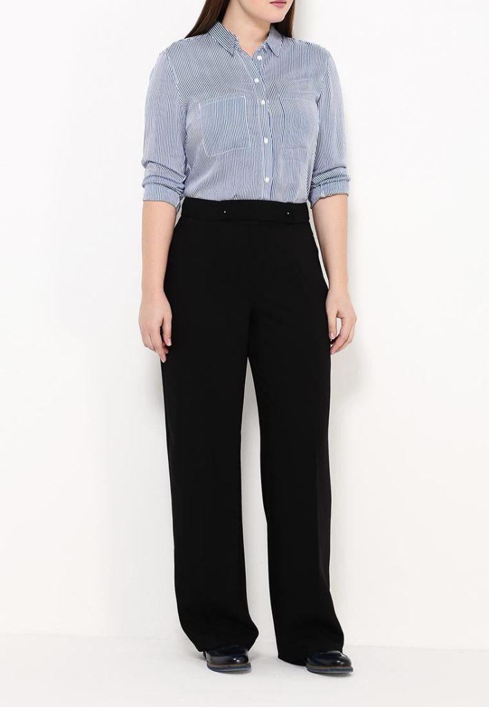- При выборе брюк стоит отдать предпочтение классическому прямому покрою. В деловой образ органично впишется модель, дополненная стрелками. Завышенная линия талии поможет отвлечь внимание от лишних объемов в области живота.