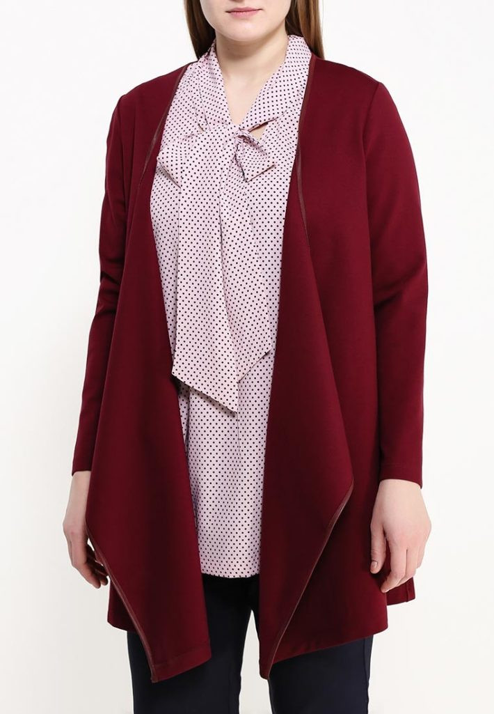 - Для ранней осени хорошим решением станет однотонный кардиган, выполненный с помощью мелкой вязки. Изделие заканчивается ниже бедра. Подол может быть асимметричным, подобное оформление поможет отвлечь внимание от недостатков.