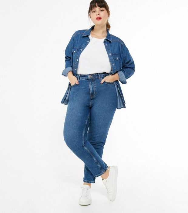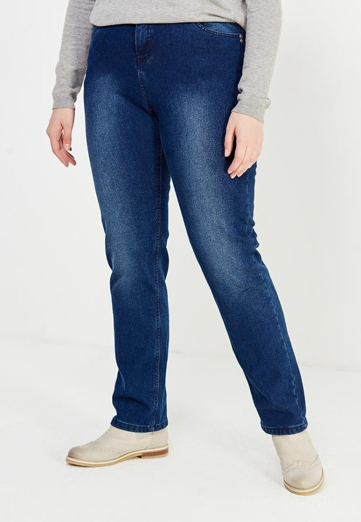 - Джинсы незаменимы для повседневной носки. На полных женщинах хорошо смотрятся фасоны классического прямого кроя, мом с завышенной линией талии, модели, расклешённые от бедра.